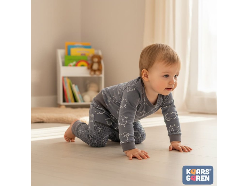 The cotton non-slip toddler pants “Sheep” in modern grey are designed for maximum comfort and safety during everyday play. Thanks to the soft cotton knit and anti-slip zones on the knees and shins, they are perfect for children who are crawling or taking their first steps. The practical size 86 and comfortable cut ensure a great fit without restricting movement.