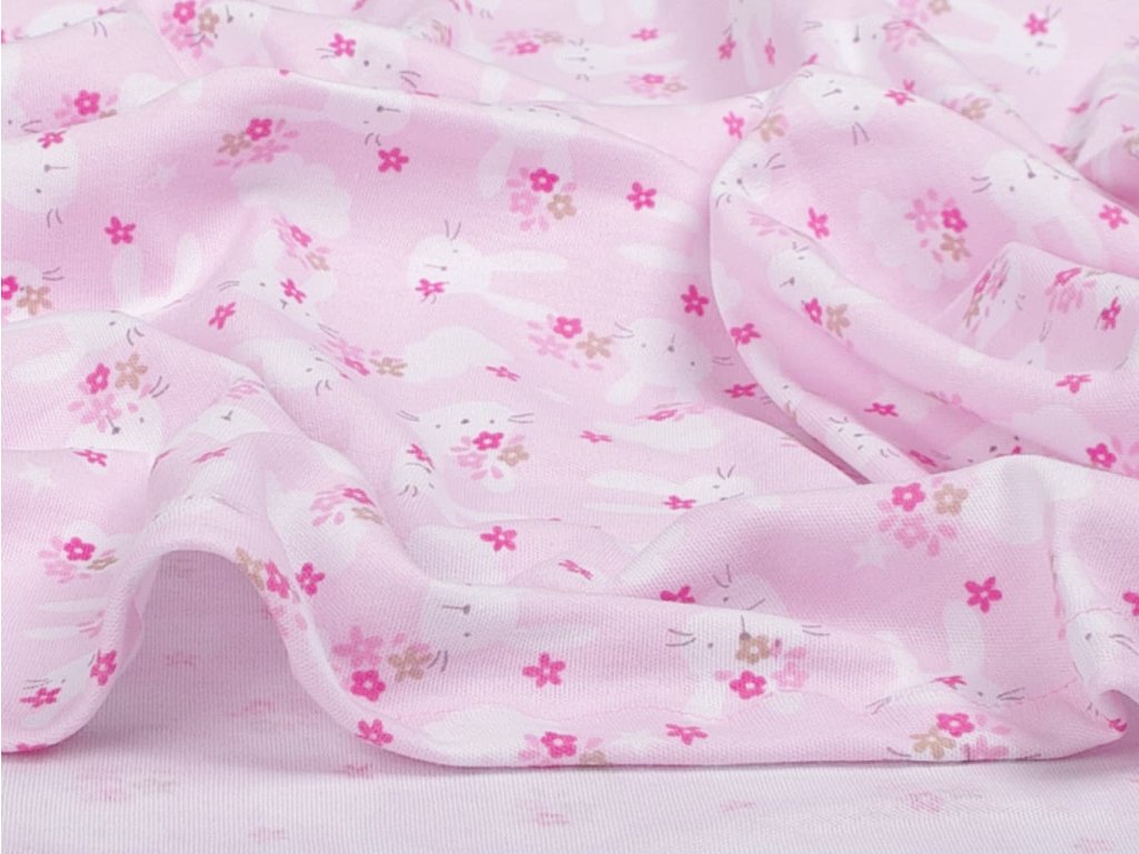 - 🐰 Motiv: bílí zajíčci a růžové kvítky na jemném růžovém podkladu