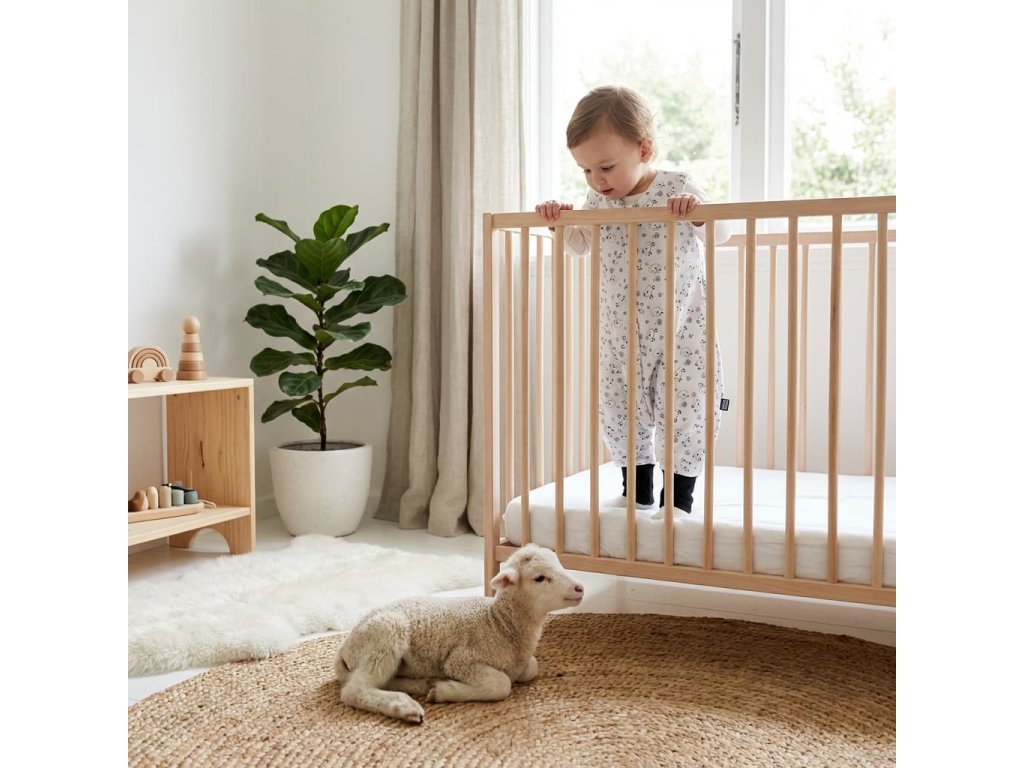- Bio-bavlněný dětský spací pytel s podšívkou z merino vlny a s motivem oveček.