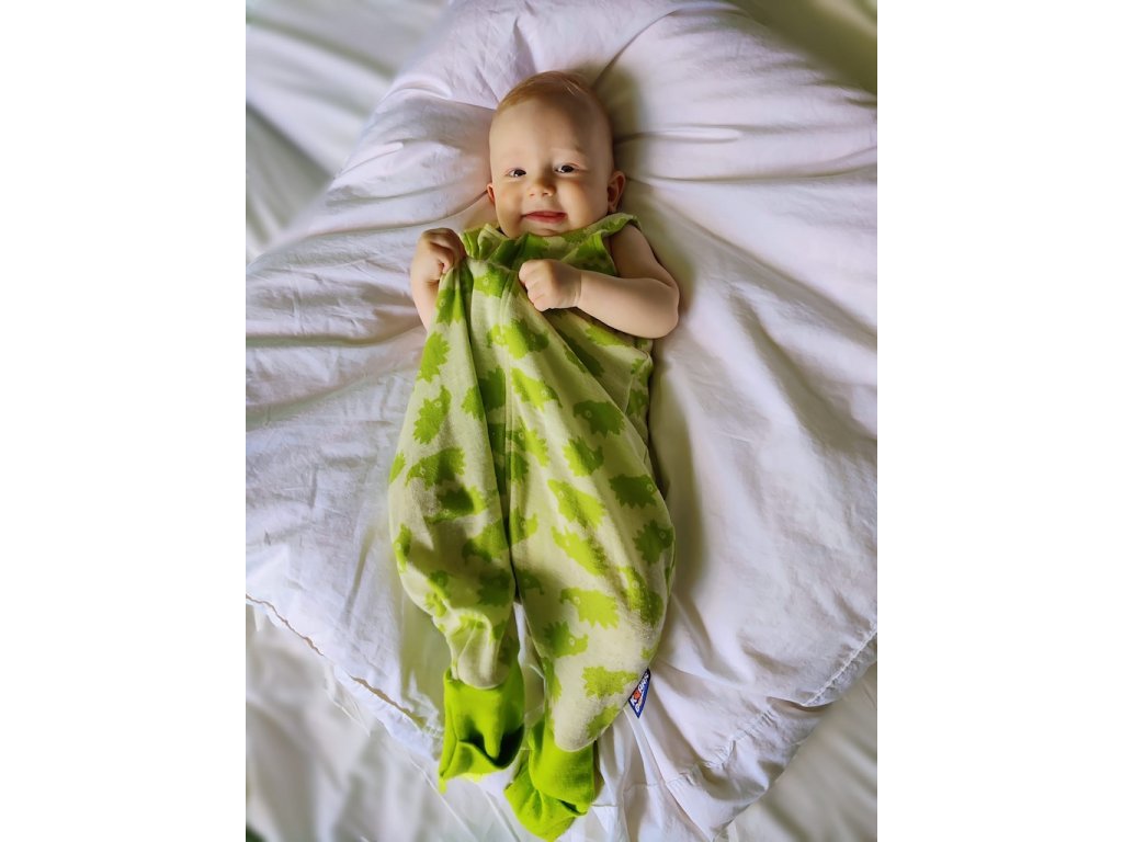 Náš spací pytel s nožičkami je vhodný pro aktivní miminka, které během noci kopou nohami a přetáčí se, nožičkovém spacáčku se nemohou přetočit. Až miminko povyroste není nutné hned kupovat větší spací pytel, protože může spát s nohami venku a zároveň až začne chodit není nutné vždy spací pytel sundavat. Spací pytel je ve spodní části rozšířený, aby v něm chůze byla pohodlná. Spací pytel je vyrobený ze 100% merino vlny. Zip umožní otevření spacího pytle po celé délce v obou směrech a má látkovou krytku, která zabraňuje přiskřípnutí krku do zipu. Pouze ruční praní v přípravcích na vlnu. Nepoužívat aviváž! Spací pytel vyrábíme v České republice.