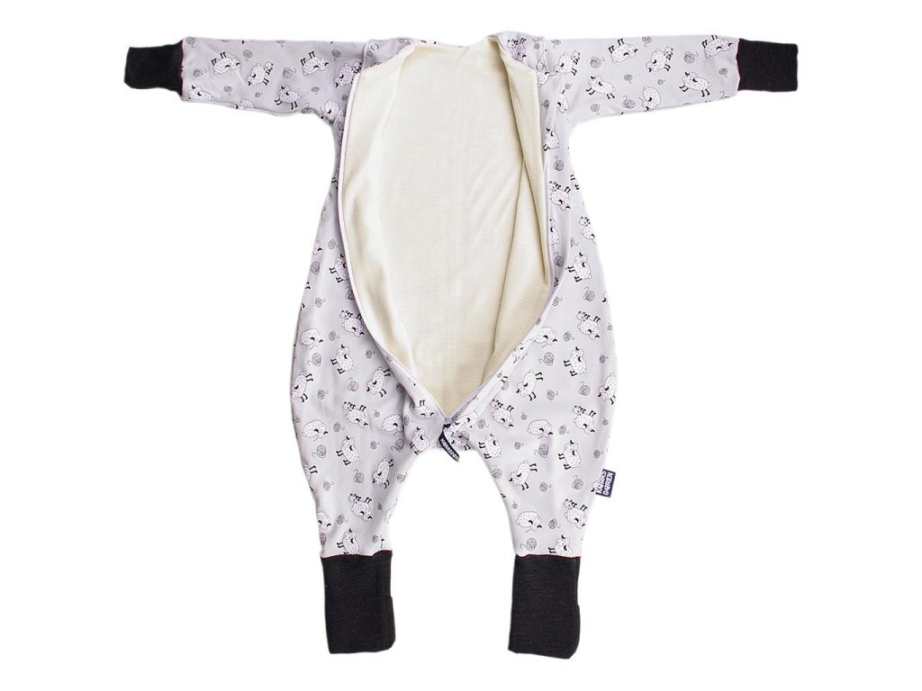 - Bio-bavlněný dětský spací pytel s podšívkou z merino vlny s motivem šedých oveček.