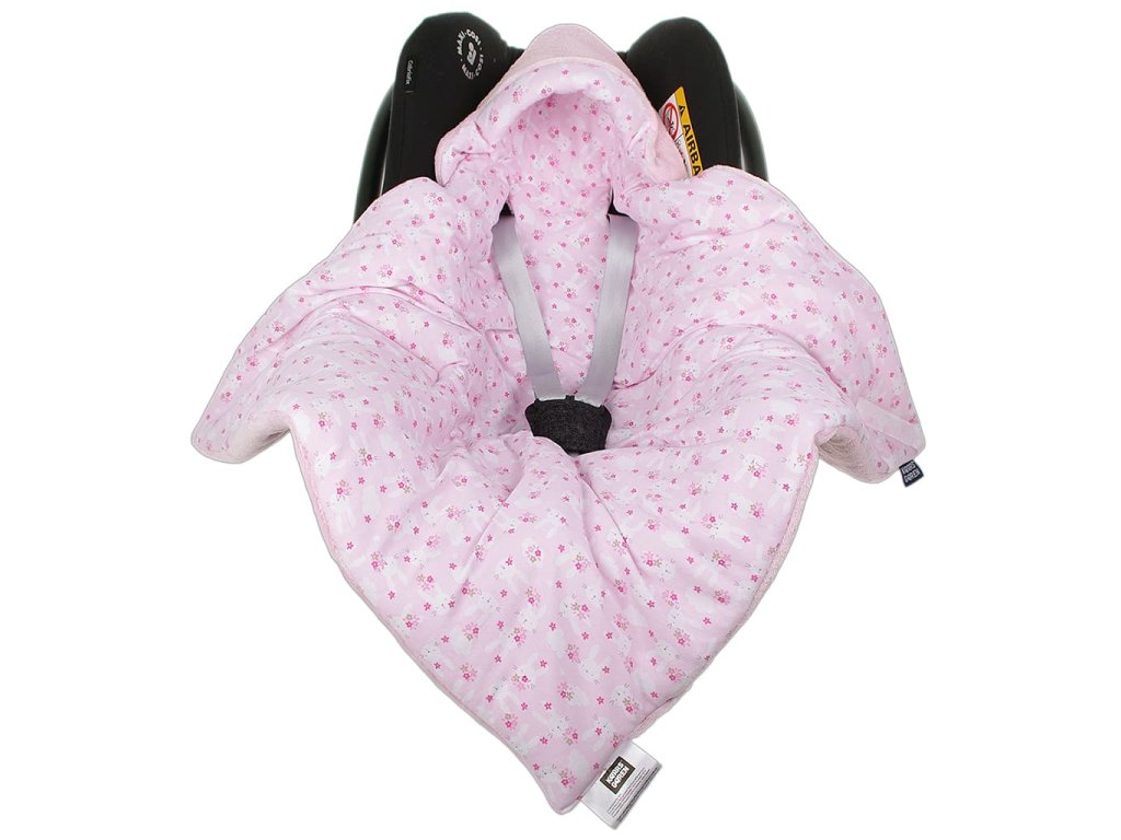 Růžová zimní zavinovačka má vrchní stranu z měkkého wellsoftu, podšívku ze 100% bavlny s roztomilým motivem zajíčků a uvnitř je vyplněná hřejivým vatelínem. Díky těmto materiálům je ideální od podzimu až do jara. Lze ji pohodlně používat i v autosedačce s tříbodovým zapínáním. Rozměr zavinovačky je cca 75 × 75 cm. Snadná údržba – praní v pračce na 30 °C. Praktické zapínání na suchý zip a kapuce zajistí miminku pohodlí a teplo. Vyrábíme v České republice.